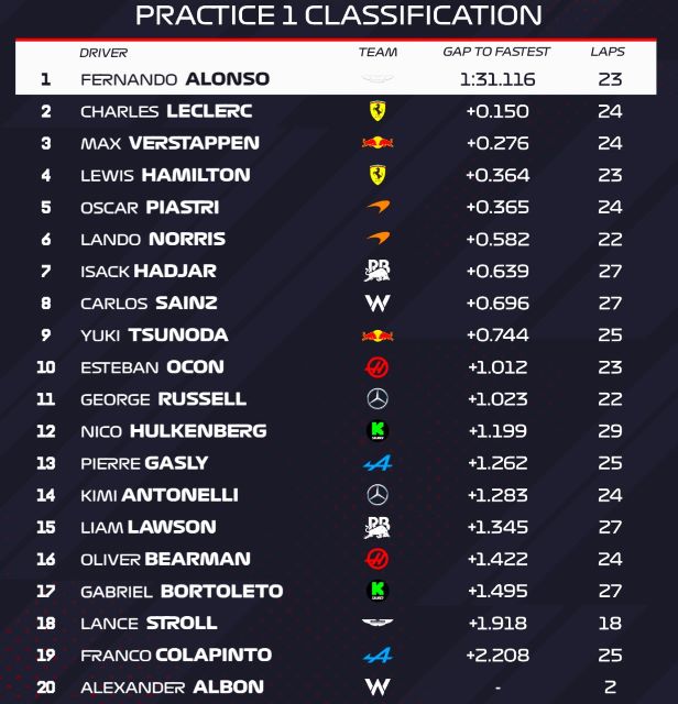 Fernando Alonso con las Pirelli medias fue el más veloz en la parte inicial de la sesión, pero luego su compatriota Carlos Sainz lo pasó y se puso al frene cuando la pista mejoró. Los demás mejoraban en general y Carlos se fue quedando rebasado, pero Fernando hizo una vuelta muy buen para regresar a la cabeza de las posiciones con 91.116 segundos, el cual seria el mejor tiempo de la Práctica 1. Le siguieron los Ferrari emparedando a Max Verstappen en tercero y los nueve primero quedaron en el mismo segundo, con Esteban Ocon en décima a milésimas arriba del segundo.