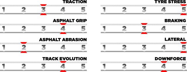 Los tres compuestos más duros de la gama Pirelli han sido seleccionados para Lusail. El C1, el C2 y el C3 son la opción obvia en un circuito donde el hule está sometido a niveles de energía similares a los de Suzuka. De hecho, son los únicos compuestos que se han utilizado en este Gran Premio en su corta existencia en el calendario de F1. La temperatura de la pista puede provocar la aparición de granulado, aunque, la gama actual de compuestos parece ser más resistente a este fenómeno.