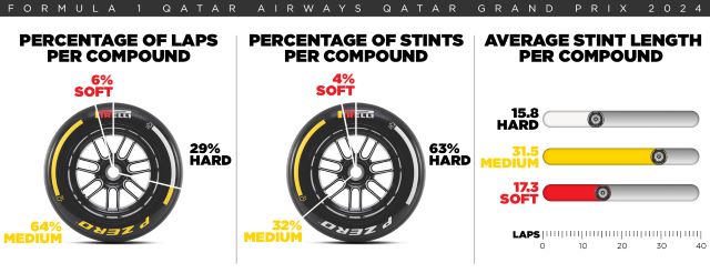 Cada juego de neumáticos suministrado a los equipos al inicio del fin de semana de carreras puede cubrir un máximo de 25 vueltas al circuito de Qatar. Las vueltas se contabilizarán de forma acumulativa en todas las sesiones de pista, incluidas las vueltas realizadas con el Auto de Seguridad, físico o Virtual. Las vueltas a la parrilla, las vueltas de formación y las completadas después de la bandera a cuadros en el Sprint no se contabilizarán. Dado que el Gran Premio de Qatar se disputa a 57 vueltas, cada piloto inevitablemente tendrá que entrar a fosos para cambar neumáticos al menos dos veces. Antes del inicio del Gran Premio, Pirelli informará a los equipos cuántas vueltas quedan disponibles para cada juego.