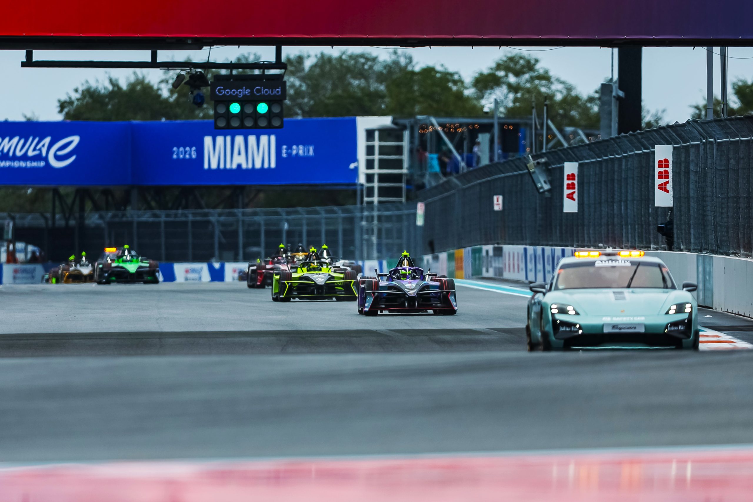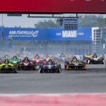 Con condiciones húmedas en Miami y sin rodaje previo en pista mojada, la carrera se puso en marcha detrás del Auto de Seguridad. El pelotón se reagrupó tras cinco vueltas de neutralización para una arrancada normal, con los líderes peleando por posición en la curva 1. como se aprecia en la secuencia de nuestro enviado: