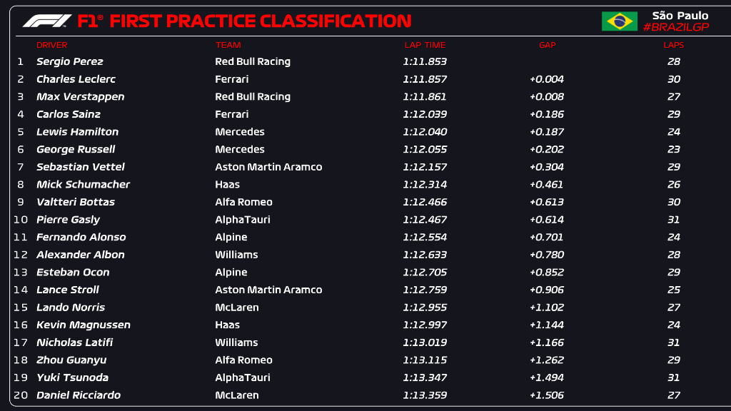 Sergio Pérez lideró la primera práctica del fin de semana en el Gran Premio de São Paulo de F1, venciendo por muy poco a Charles Leclerc y a Max Verstappen.