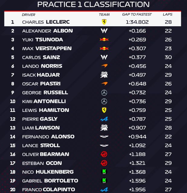 El agarre fue creciendo en el transcurso de la sesión y los tiempos bajaron de los 96 segundos altos a los 85 y se entabló una batalla entre Charles Leclerc y Max Verstappen, que ocuparon sucesivamente la posición de honor al tope de los tiempos. Cerca del final, cuando algunos calzaron las Pirelli suaves rojas, se rompieron los 95 segundos. El primero en acercarse fue Yuki Tsunoda con 95.071 segundos, pero luego Leclerc hizo una vuelta impresionante en 94.802s para arrebatarle la cima y Alex Albon puso al Williams segundo con 94.968s, aunque Yuki se conservó en tercero con 38 milésimas de ventaja sobre Max, con Carlos Sainz completando el quinteto inicial a 70 milésimas del tetracampeón.