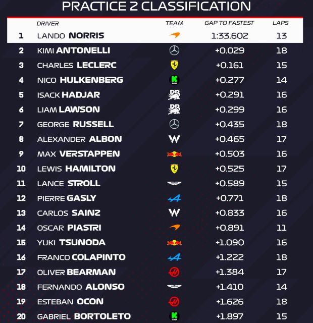 La bandera verde regresó con poco menos de seis minutos restantes y todos salieron a dar las vueltas finales, aunque algunos prefirieron completar sus programas de puesta a punto, dejando las series cortas para el viernes. Los tiempos bajaron y el mejor crono fue para Norris con 93.902 ahora seguido por Andrea Kimi Antonelli en 93.631s, Leclerc en tercero, Nico Hulkenberg en cuarto y los VCARB, con Isack Hadjar adelante, completando la primera media docena y Oscar Piastri apenas en decimocuarto, reportando algunos problemas de frenos. .