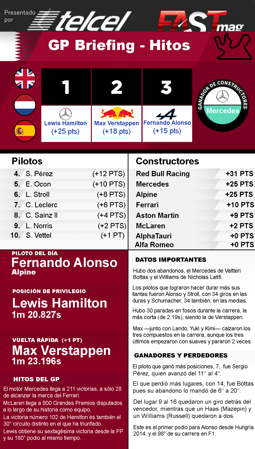 Inicio FÓRMULA UNO GP BRIEFING: Los HITOS y todo lo que dejó el GP de... GP BRIEFING: Los HITOS y todo lo que dejó el GP de Qatar F1 22 noviembre, 2021 No te pierdas los números, las estadísticas, datos curiosos y todos los HITOS del primer GP de Qatar de F1, que fue la 19º fecha del Mundial 2021. PRESENTADO POR TELCEL Artículos relacionadosMás del autor El Rally Durango Express inicia en 2026 su historia en la Sierra Madre Occidental El GT World Challenge Europa arranca en Paul Ricard con victoria de Aston Martin Persiguiendo el Título IndyCar, R4 Alabama -Kirkwood lidera sobre Malukas; Pato, 8°