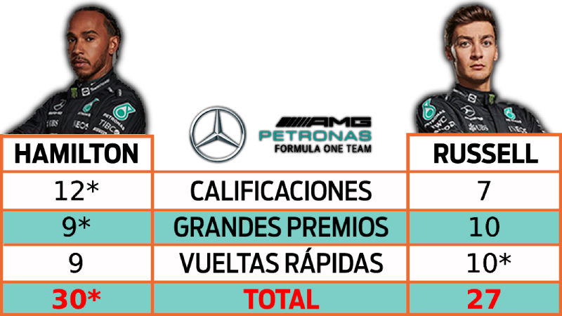 Después de comenzar la temporada 7-17 y con la mayoría de los analistas diciendo que Hamilton estaba acabado y el futuro era Russell, ahora vemos al heptacampeón realizar una remontada, anotarse un 23-10 desde el Gran Premio de Canadá y estar tres puntos por encima de George en la general. No sólo eso, otra vez le ganó en la calificación por lo que ha asegurado la temporada con un 12-7 a falta de tres fechas. Russell no ha ganado una sola calificación de las últimas seis.