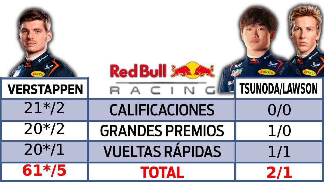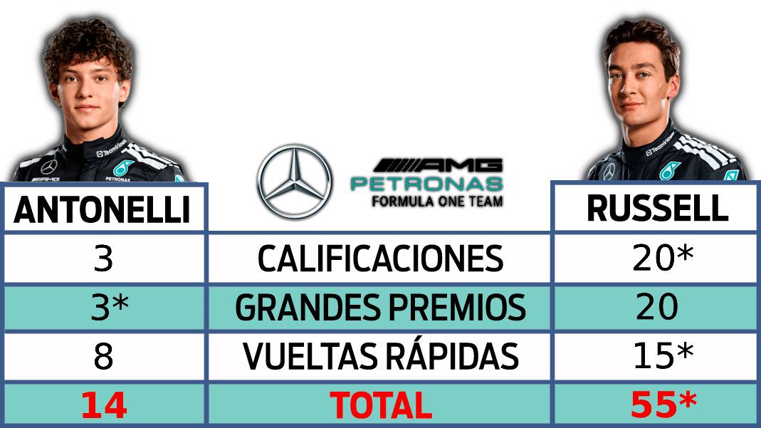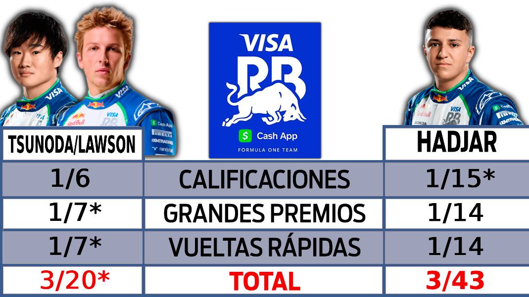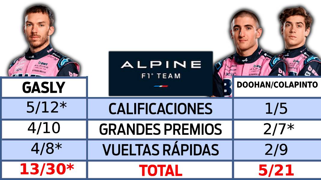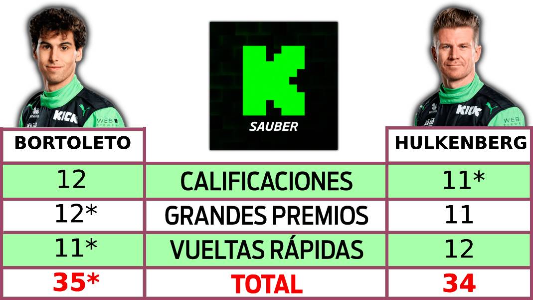 En Sauber, el empate entre coequiperos se rompió una vez más y es Bortoleto el que tiene ventaja al salir de Qatar con un 35-34. Lo peor para Hulkenberg es que Gabi ya aseguró el empate en Calificaciones y Grandes Premios, algo que no se ve bien para un piloto experimentado con casi 250 Grandes Premios corridos que compite contra un novato.
