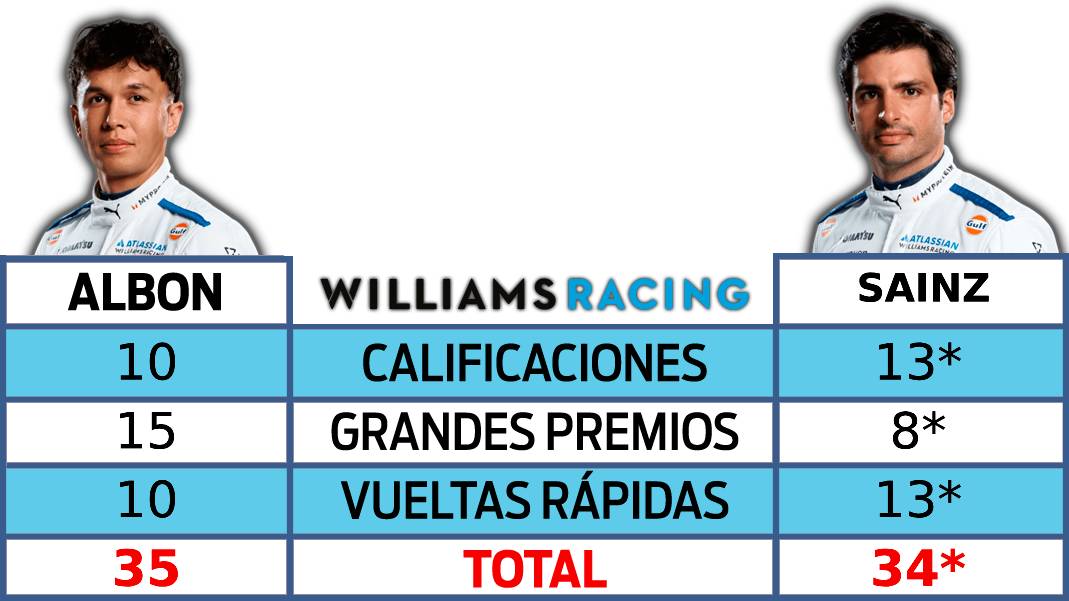 Sainz logró una barrida sobre Albon y con eso forzó que la guerra entre coequiperos se vaya a decidir en Abu Dhabi. El español ha barrido al tailandés las últimas dos semanas y con eso se colocó 34-35 a sólo un punto con tres por disputarse. Lo más curioso es que, además de todo, podría quitarle el noveno sitio en el campeonato pues ya está a nueve puntos. Se ve complicado, pero ni imposible sabiendo que Abu Dhabi es una buena pista para Williams.