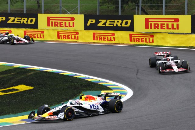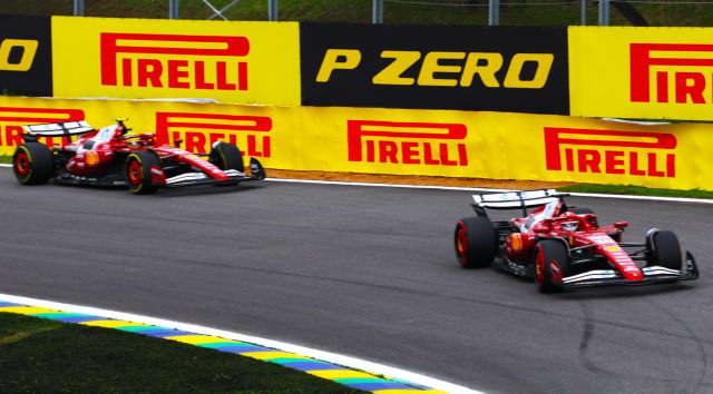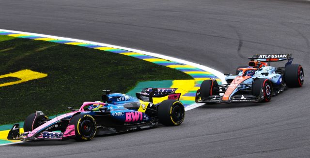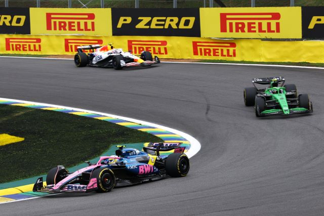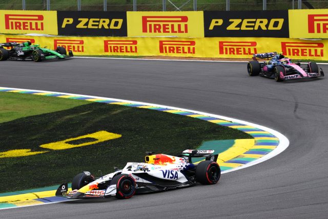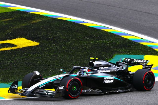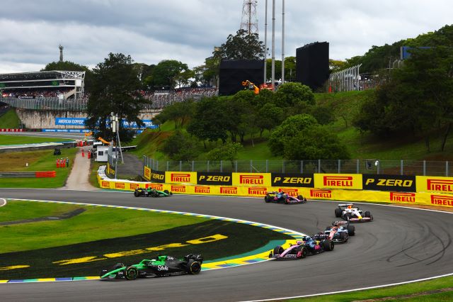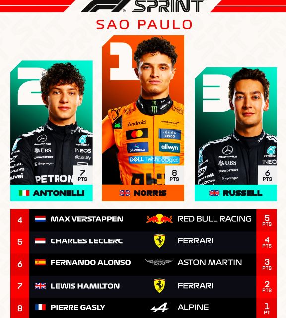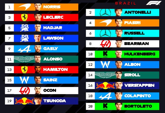 Tras las lluvias nocturnas, la pista de Interlagos amaneció muy resbalosa, aunque secándose al subir el sol. Los autos se formaron para la parrilla con Yuki Tsunoda y Carlos Sainz yendo a los fosos para cambiar llantas, pue la mayoría eligió las Pirelli medias, aunque entre los punteros los dos Mercedes y Max Verstappen calzaban las suaves para las 24 vueltas del Sprint. LA arrancada de Lando fue buena y tomó la punta sin problemas manteniendo a Andrea Kimi a raya mientras este era presionado por Oscar Piastri, quien no le pudo quitar el sitio, y Max si avanzó para ponerse sexto aras de Alonso. La primera vuelta fue casi limpia excepto por un cerrón de Bearman a Lawson, que luego Liam contestó frenando tarde por dentro para tocarse con Oliver y tromparlo, lo cual dejó atrás al inglés de Haas, y ambos serían penalizados posteriormente por los comisarios por sus actitudes antirreglamentarias. El pelotón empezó a abrirse, de hecho, Lando se salió de rango de DRS desde la primera vuelta, y los que calzaban Pirelli rojas se dieron cuenta que iban a tener problemas para hacerlas durar pues con la pista resbalosa el desgaste era mayor.