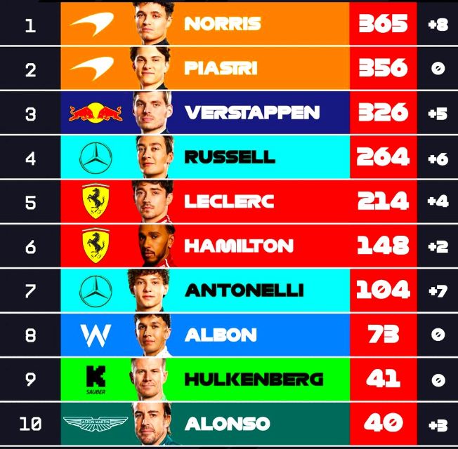 Para el domingo a las 11:00 de la mañana se espera una carrera sin lluvia de inicio, pero el invitado climático podría aparecer más tarde, aunque no es seguro. Lando parece tener un fin de semana impecable hasta el momento y termina la jornada sabatina con mayor ventaja en los puntos, como se aprecia en la tabla: