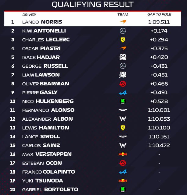 Tras la premiación vinieron las reacciones mixtas en McLaren, y el trabajo de los equipos para reparar los autos para la Calificación que se correría tres horas después, aunque arrancó un poco tarde la Q1 por una reparación a una barrera. La sesión inició sin Bortoleto, cuto auto no fue reparado aunque estaba sentado en la cabina listo para arrancar sin terminaban sus mecánicos. Con el sitio 20 definido, vinieron las sorpresas al quedar fuera los dos RB21, Max (16) y Yuki Tsunoda (19), además del Haas de Esteban Ocon (17) y el Alpine de Franco Colapinto (18), siendo particularmente mala la situación del tetracampeón mundial que nunca encontró balance en su auto