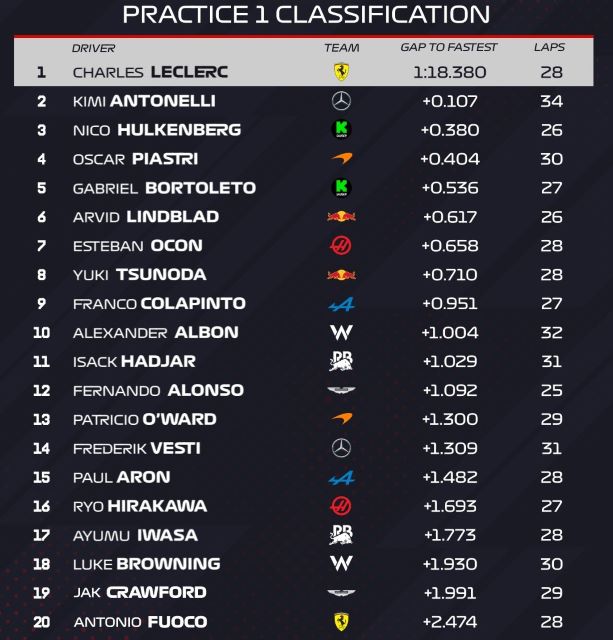 Lando Norris, de McLaren, fue cuarto, pero su coequipero y líder del mundial, Oscar Pistri quedó duodécimo mientras que el resto de los 10 mejores fueron del cuarto sitio, Lewis Hamilton, en otro Ferrari, seguido por George Russell (Mercedes),Yuki Tsunoda (Red Bull), Fernando Alonso (Aston Martin), Carlos Sainz (Williams) y Lance Stroll (Aston Martin).
