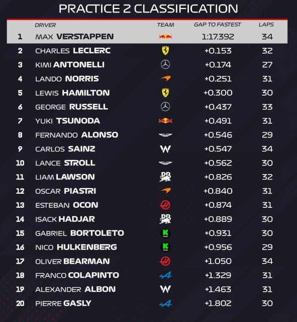 Los siguieron lso que encabezaron la primera práctica, en segundo lugar Charles Leclerc, de Ferrari, a 153 milésimas y luego Andrea Kimi Antonelli, que fue el mejor novato también y mostró una gran adaptación al trazado capitalino, al cerrar tercero, con Mercedes, a casi medio segundo de Max.