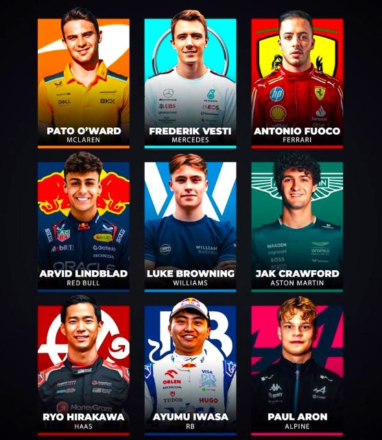 La Práctica 1 tuvo a los nueve “novatos” que exige el reglamento que tengan una sesión y sólo Sauber mandó a sus titulares, los cuales acabaron entre los cinco mejores, aunque el tiempo más rápido fue para Charles Leclerc. Aquí vemos a los nueve reservas: