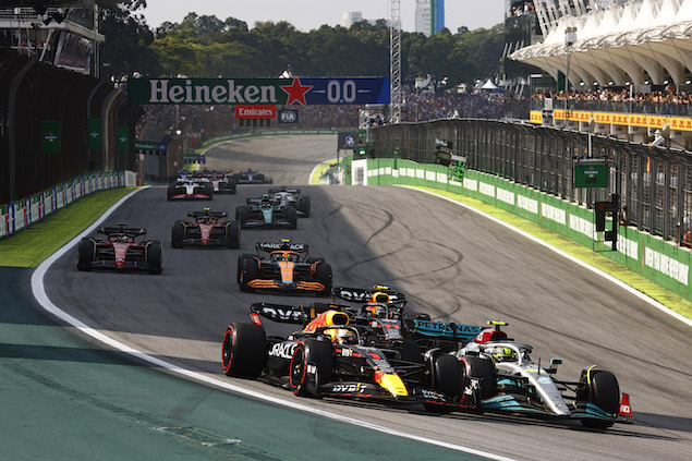 Los rivales por el título de F1 del año pasado se tocaron en la séptima vuelta de la jornada de este domingo en Interlagos, en la cual el neerlandés intentó quitarle el segundo lugar al británico por la línea exterior de la Curva 1.