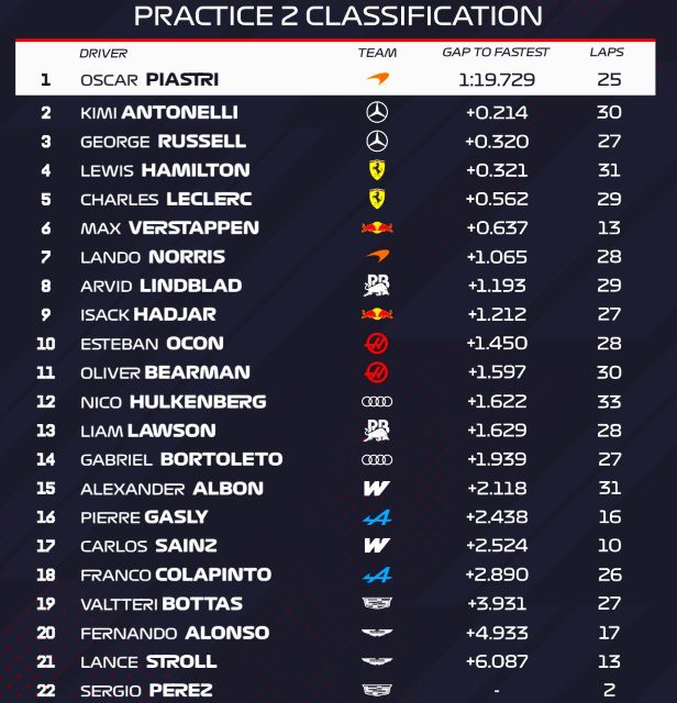 La sesión siguiente, Práctica 2, trajo un reacomodo, pues algunos de los autos ajustaron el mapa del motor para tener una potencia más representativa de lo que vendría en la carrera. Hubo corridas largas y en ellas los Mercedes fueron muy constantes y rápidos, girando en los 84 segundos gran parte del tiempo, territorio inédito ara la mayoría del resto. Sin embargo, a la hora de hacer una vuelta rápida, el local Piastri sacó la cara y marcó 79.729 segundos, seguido por Andrea Kimi Antonelli a 184 de segundo y Russell en el otro Mercedes poco más de otra décima detrás en tercero. Les siguieron los Ferrari y Max en la primera media docena. Por su parte, el Cadillac MAC-26 de Sergio se quedó en la pista en su segunda vuelta y no puso un tiempo terminando la sesión temprano y en el último sitio. Así quedaron al final del viernes: