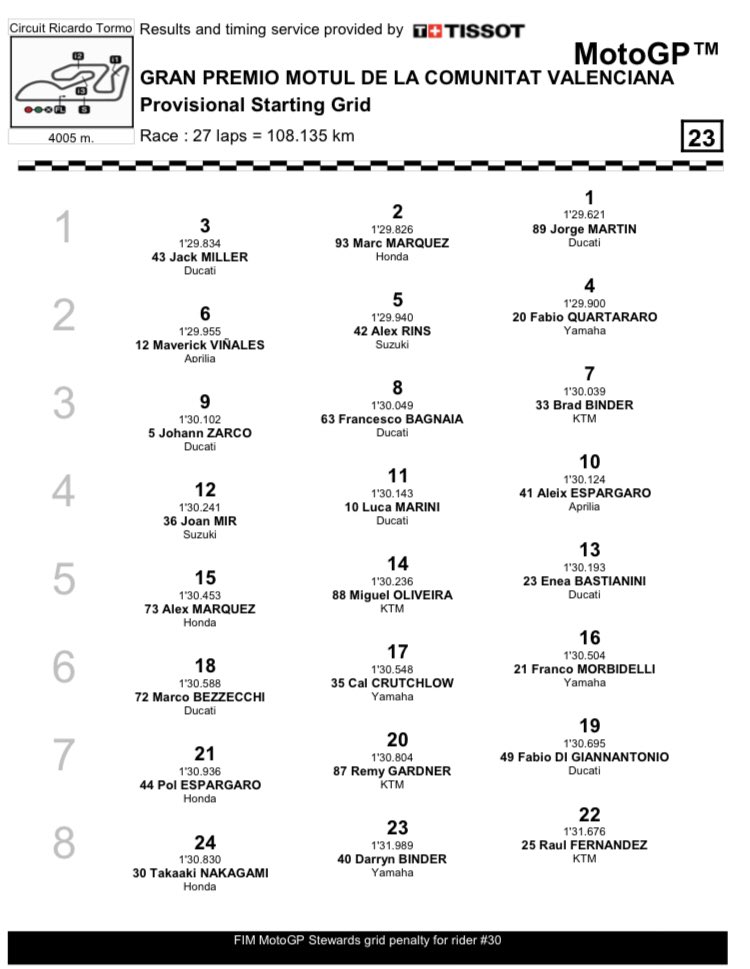 De destacar que Cal Crutchlow iniciará en 17º mientras Takaaki Nakagami, en su regreso a la categoría, lo hará desde el 21º puesto, por detrás de Remy Gardner, quien se despide de MotoGP.