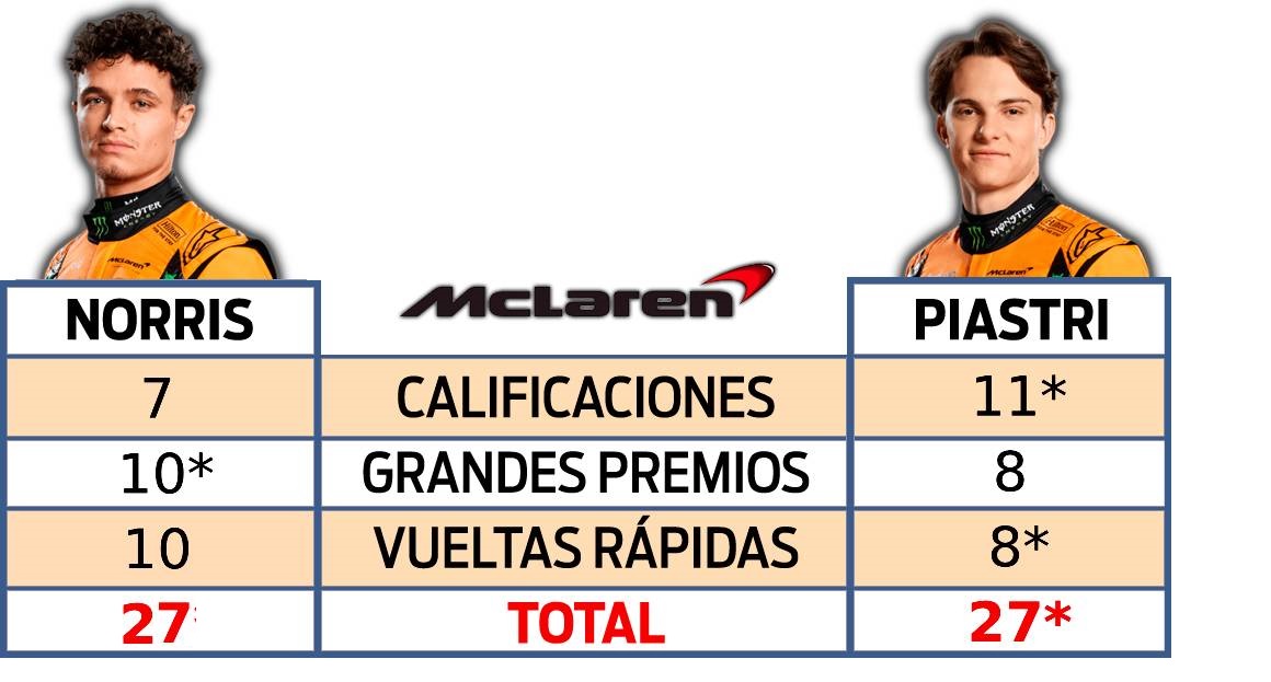 Primero está McLaren donde Piastri ya empató a Lando en 27 puntos. La gran diferencia es que Piastri va ganando la batalla los sábados con un 11-7 y eso le ha permitido perder los domingos 8-10. Sin embargo, nada elimina la posibilidad de que el australiano tenga otra racha de victorias y podios como a principios del año y eso podría inclinar la balanza a su favor.