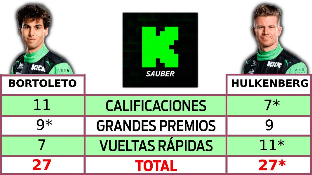 Otro par que va con 27 puntos por cabeza es la dupla de Hulkenberg y Bortoleto donde el alemán está usando toda su experiencia para mantener al joven brasileño a raya. El paulista lleva ventaja los sábados, pero Hulkenberg ha demostrado el manejo situacional para estar empatado a 9 Grandes Premios por cabeza, aún cuando su posición de arranque es 1.83 sitios por detrás de Gabi.