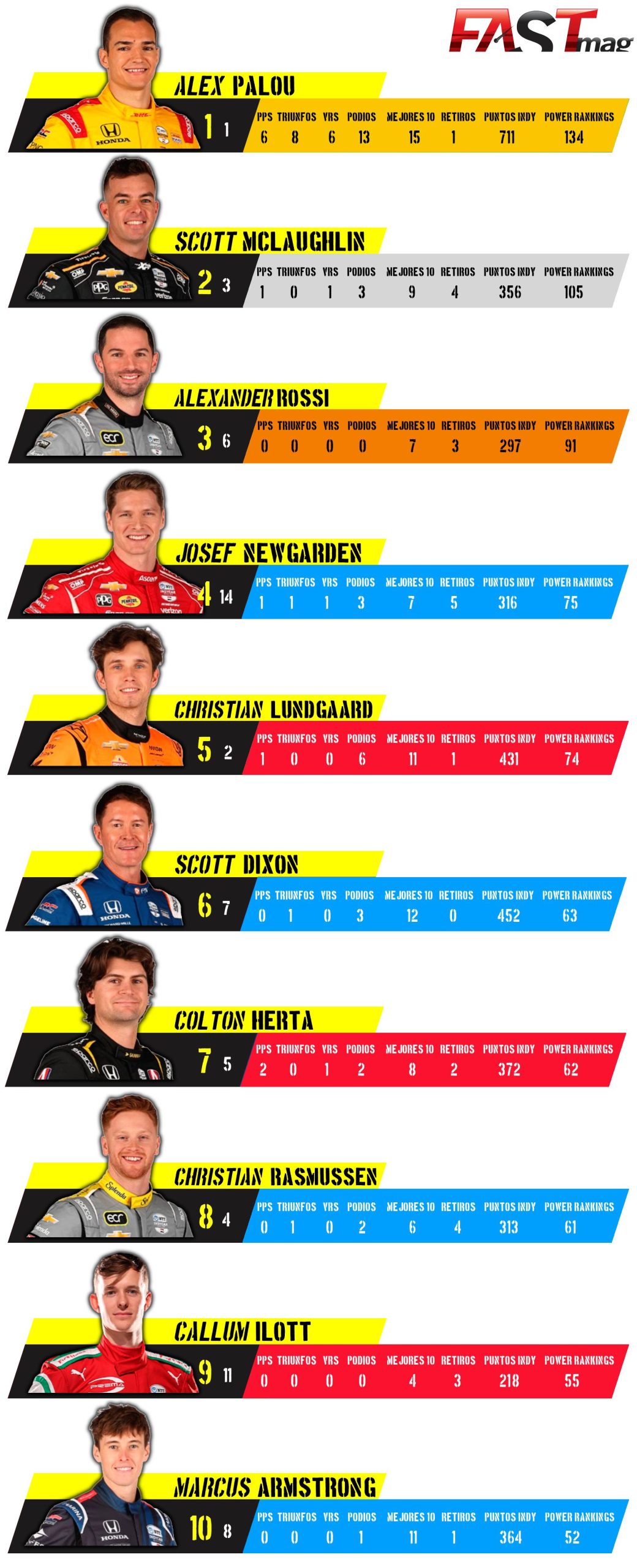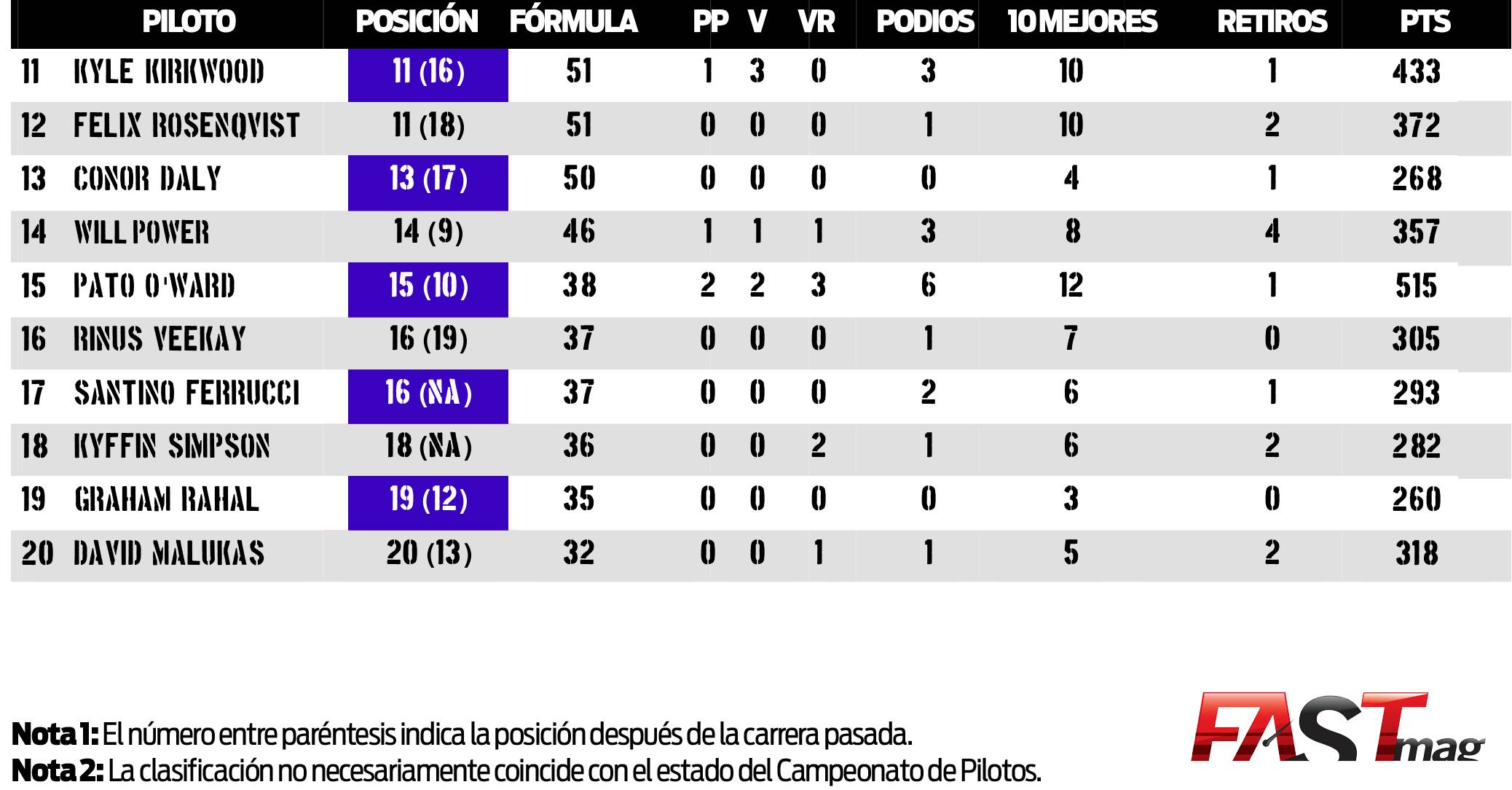 O´Ward cayó otro poco pues este ciclo lo vio tener sus dos peores resultados del año y por eso está en la posición 15. Honestamente, al mexicano sólo le falta la constancia que tiene el equipo Ganassi para poder pelear el título de tú a tú con los mejores. Esperemos que en 2026 pueda arrancar fuerte desde la primera fecha y así luchar por un título que ya se merece.