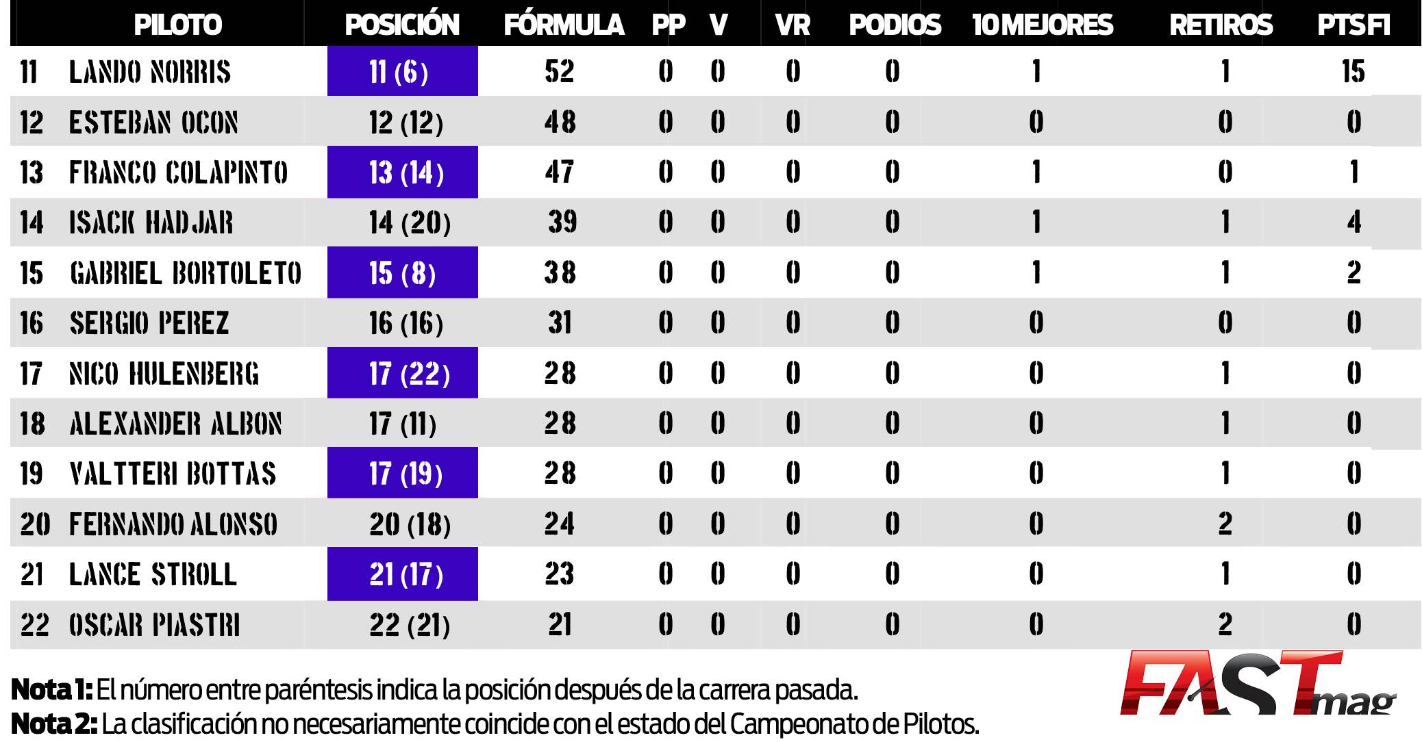 Como suele pasar al principio del año, antes de que tengamos un ciclo completo de 4 Grandes Premios, hay muchos cambios drásticos cada semana. Por eso no es raro ver que tuvimos a tres pilotos avanzar seis posiciones, Lawson, Sainz y Hadjar, después de mejorar, por mucho, sus actuaciones en China contra el resultado que obtuvieron en Australia. El caso opuesto viene de Bortoleto que perdió siete posiciones al no poder arrancar el GP de China.