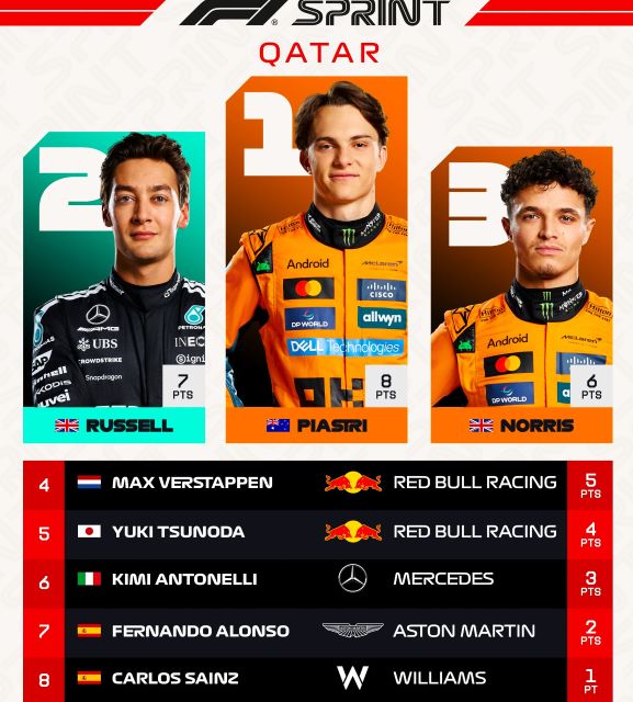 Atrás de Alonso se formó un tren que luego sería de DRS en las primeras vueltas, pero luego sse ampliaría y sería un tren sin DRS excepto en casos particulares, como el de Andrea Kimi Antonelli quien avanzó al sexto sitio delante de los españoles. La carrera fue aburrida después de que Max quedó fuera de rango de DRS de Lando y el resultado fue previsible pues nadie tenía mucho que arriesgar y los que podían beneficiarse lo hicieron al inicio y luego conservaron sus sitios. Piastri rompió su racha sin victorias, de casi tres meses, y además ganó el Sprint de Qatar por tercer año consecutivo. Lo más emocionante fue que a Yuki le dieron una penalización de cinco segundos y se suponía que perdería e quinto sitio ante Antonelli, pero a este también le dieron una pena similar por exceder los límites de pista y se neutralizaron sus castigos conservando ambos sus sitios ya que estaban muy por delante de Alonso.