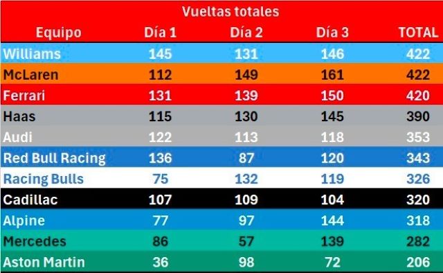 Y el análisis nos dirá que los cuatro equipos grandes ocuparon los seis primeros sitios, Y Cadillac volvió a cargar el farol rojo con Valtteri Bottas en decimoséptimo sitio, mientras que Sergio fue decimocuarto. El cierre de la primera fase de la pretemporada dejó estos tiempos el viernes.