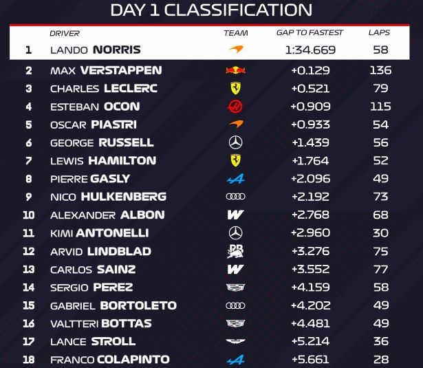 El día no fue tan productivo y solamente Esteban Ocon, de Haas, y Max Verstappen, de RBR, dieron más de 100 vueltas en el día, pero el mejor tiempo fue para Lando Naorris, el campeón mundial flamante, quien marcó 94.669 segundos superando al tetracampeón por poco más de una décima y fueron los dos únicos en romper la cifra de 95 segundos, pues Charles Leclerc, en el Ferrari quedó ya en 95. 190 segundos, y el cuarto fue Ocon ya en 96 segundos.