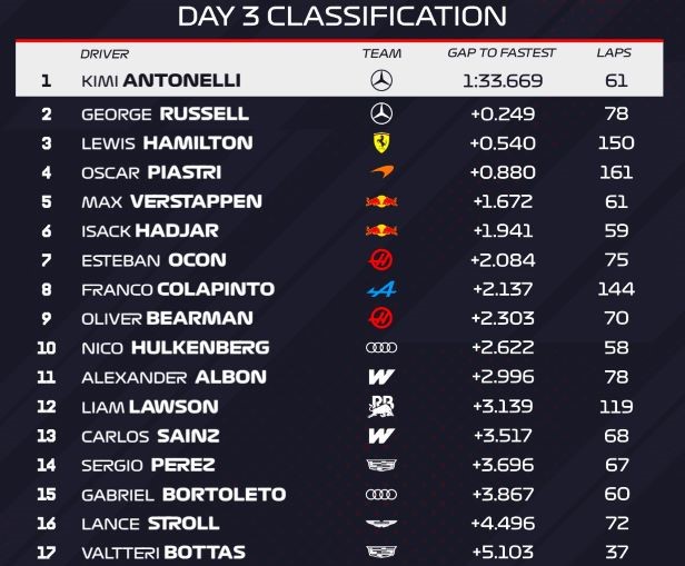 Lo sorprendente fue que Andrea Kimi Antonelli logró el mejor crono con 93 669s superando a su líder nominal, George Russell, por casi ¼ de segundo. El mejor del resto fue Lewis Hamilton con su Ferrari y en 94.209s con Oscar Piastri y Max Verstappen completando el quinteto puntero.